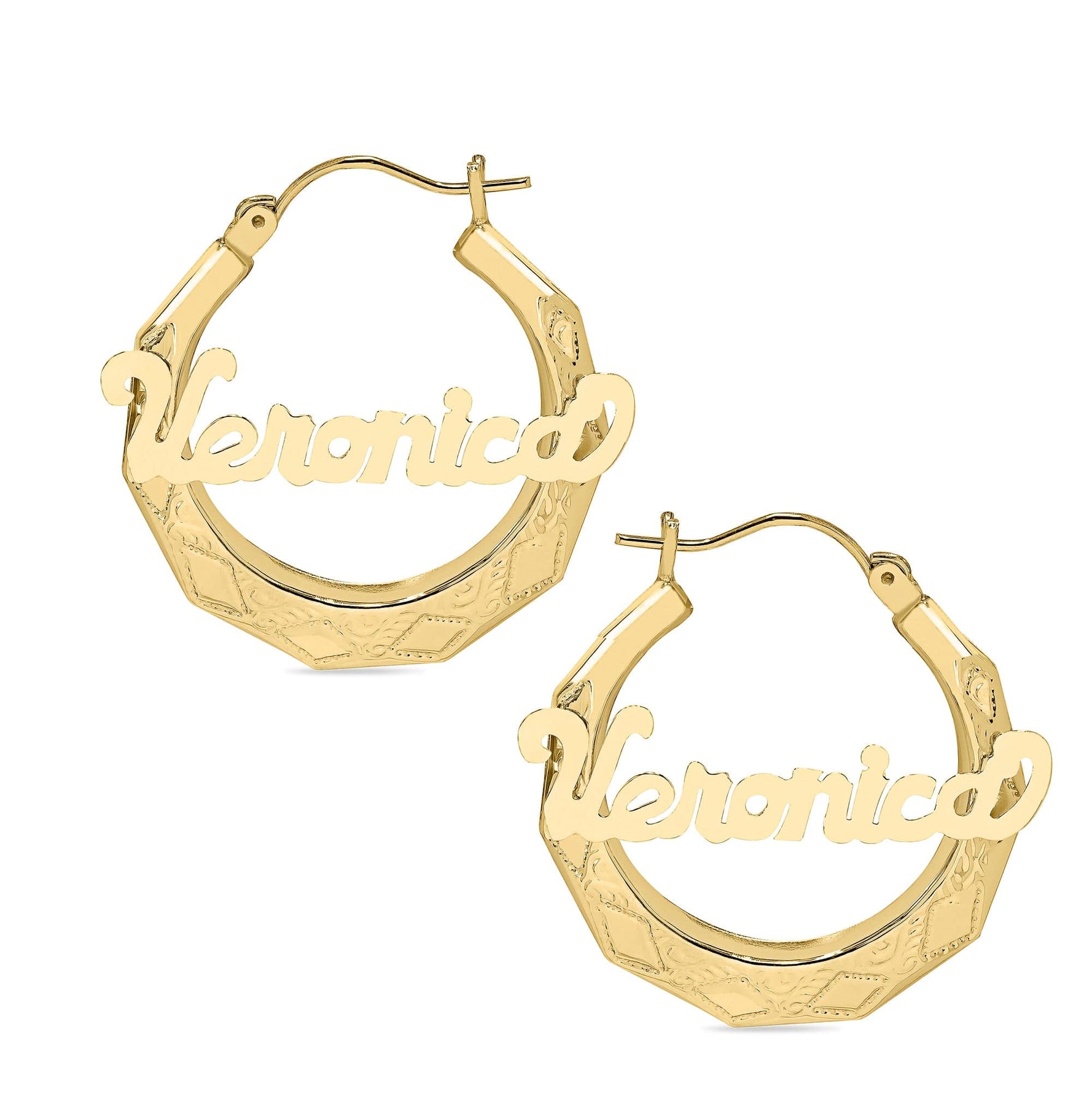 Stay in style with these hoop earrings that feature a delightful embossed or bamboo design. Available in Sterling Silver and 14k over Sterling Silver. Can be personalized with a name of up to 10 characters. These hoop earrings secure comfortably with hinged backs. Get yours today!