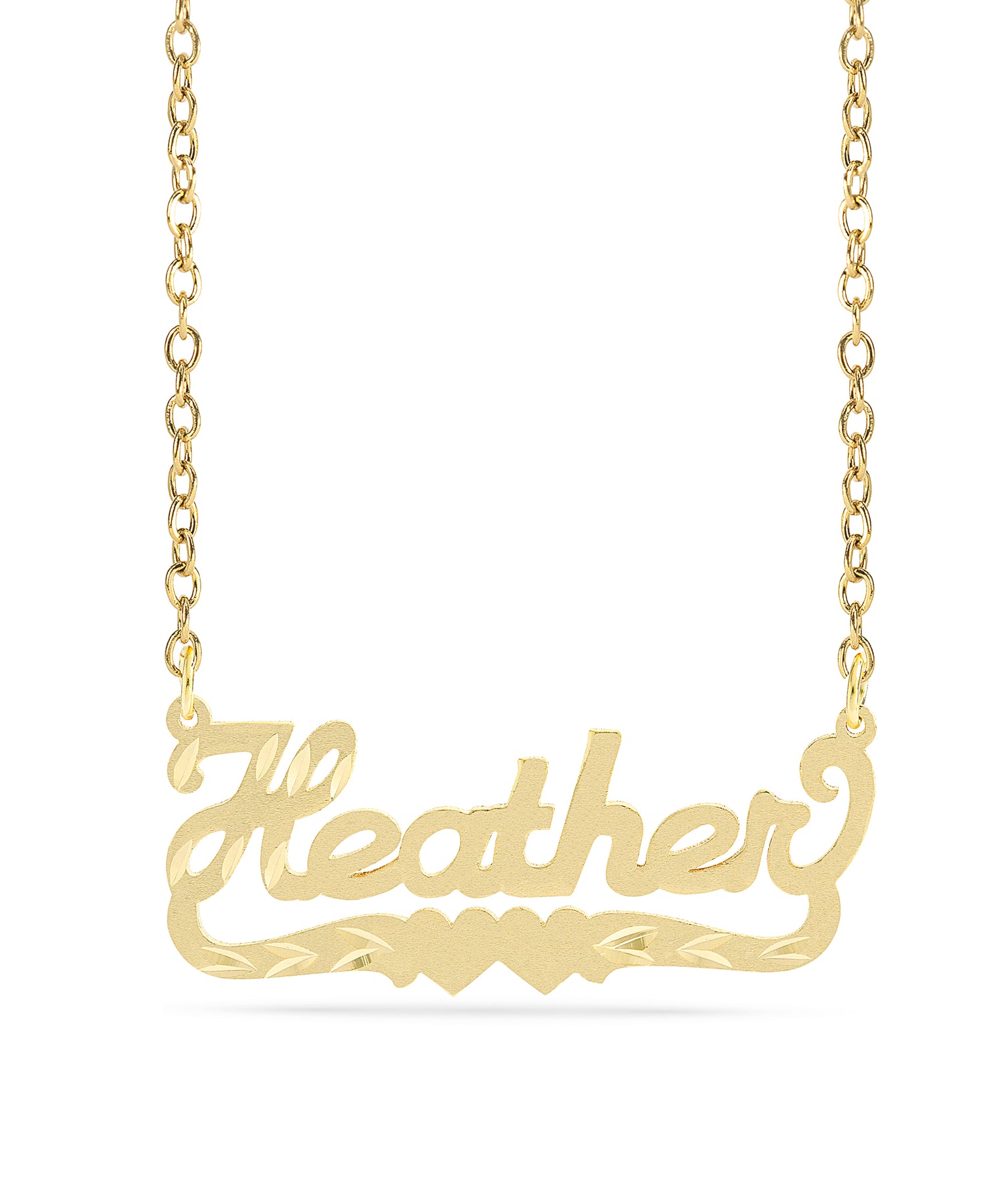 This Name Pendant with Diamond cut "Heather" is available in either: Silver Plated Gold Plated Sterling Silver and 14K Gold over Sterling Silver. You can choose up to 10 characters (Letters only, NO numbers or special characters).